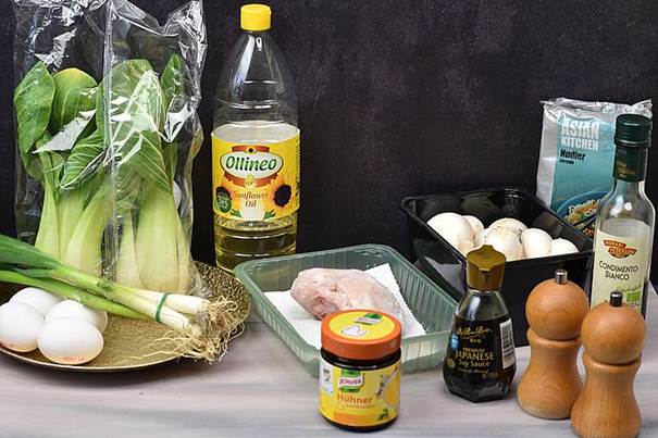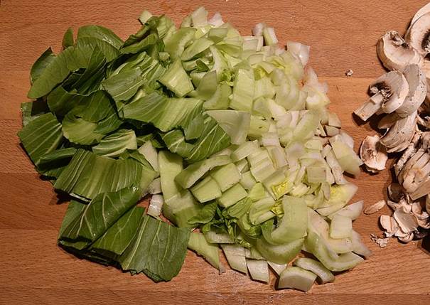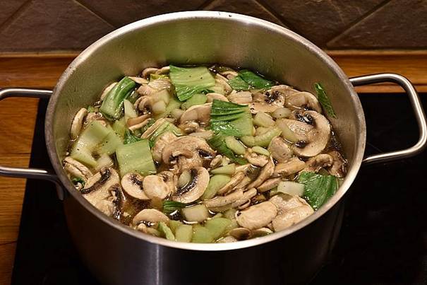pakchoien fint, og hak bladene groft. Tilsæt svampe, det hvide