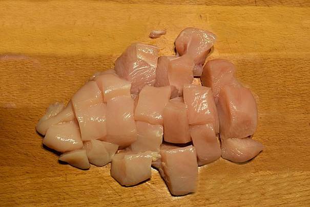 afpuds kyllingekødet, og skær det i mindre stykker, skyl det