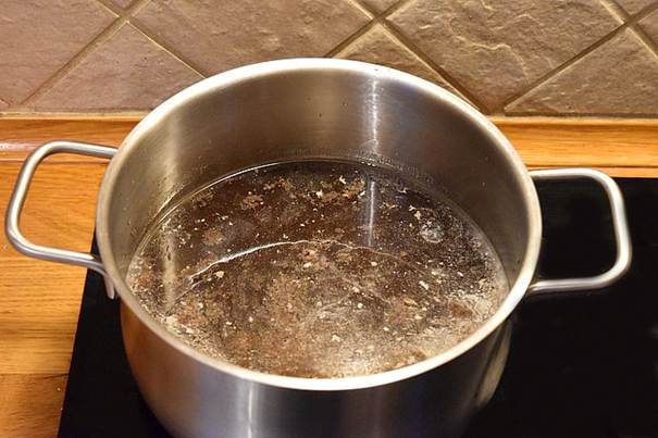 i koldt vand, kom kyllingestykkerne i bouillonen. Lad det koge
