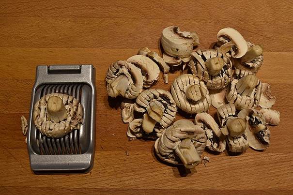 Rens svampene, og skær dem i skiver. Snit det hvide på