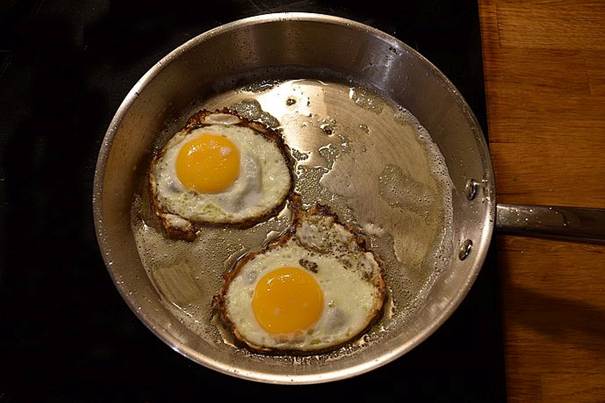 Spejl æggene i olie, krydr med 1 knsp salt og frisk