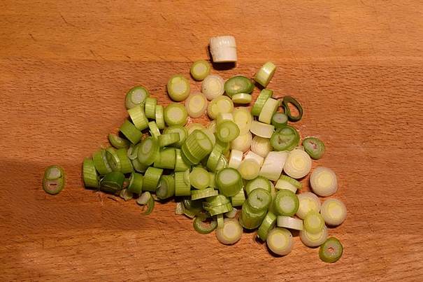 forårsløgene fint, og tilsæt dem sammen med de grønne blade