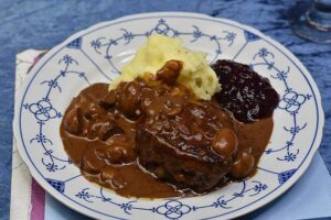 Jægerbøf med kartoffelmos og tyttebærsyltetøj