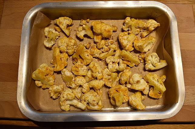 bageplade med bagepapir. Vask blomkålen og snit det i små