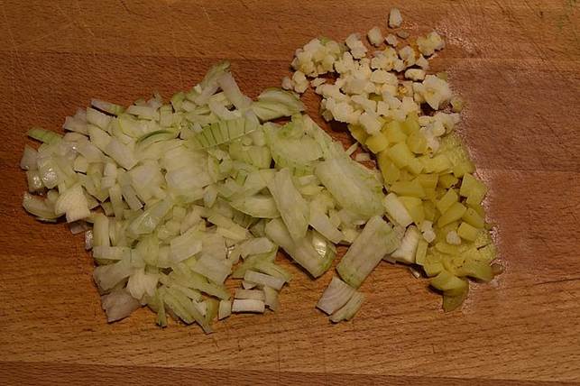 Snit løg, hvidløg og ingefær fint, dræn kikærterne og skyl dem godt