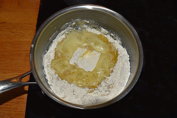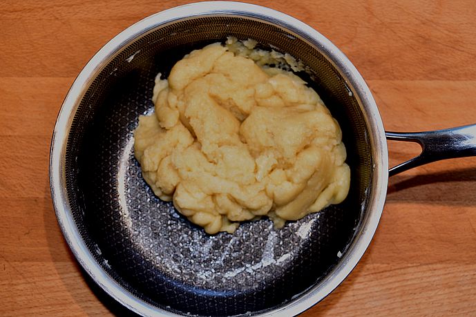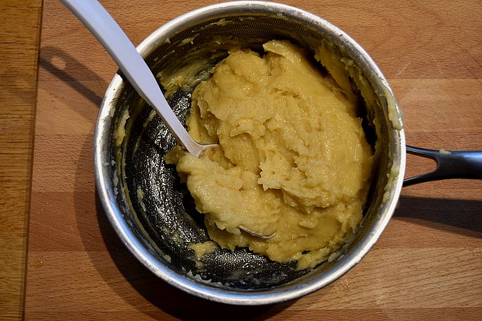 Gryden trækkes fra varmen og dejen afkøles i ca. 10 min.