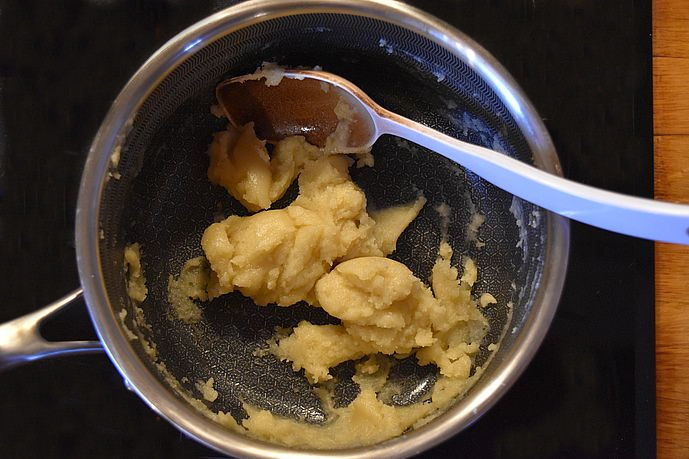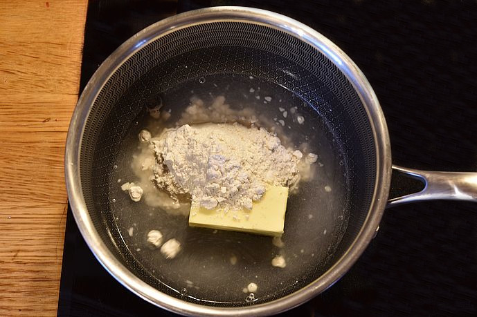 kom smør og vand i en gryde, bring det i kog. Tilsæt hvedemel