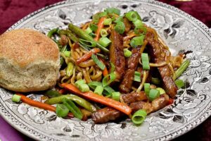 Bøf sukiyaki med stegt salat/kål og jasmin fuldkornsris