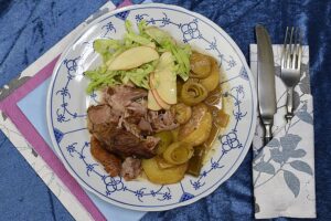 Andesteg langtidsstegt med rødkål, brunede kartofler og sauce