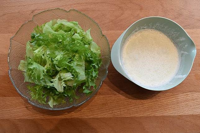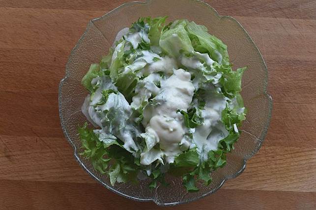 Mormorsalat, hovedsalat + fløde/mælk, 1tsk.sukker, 1 spsk. Citronsaft