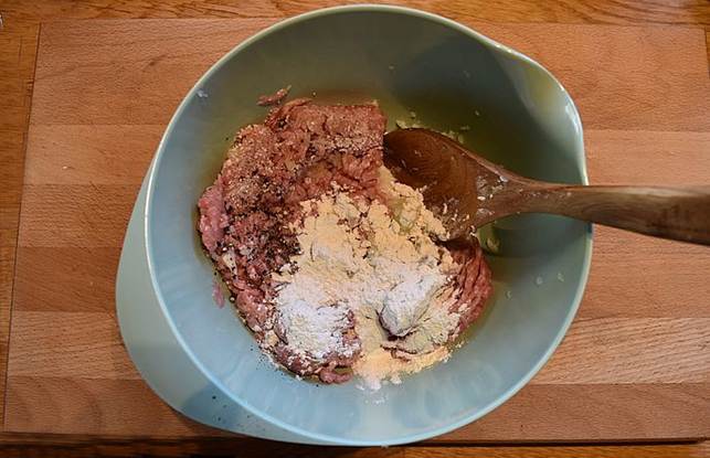 Start med at røre farsen med mælk, æg, revet løg, salt, peber