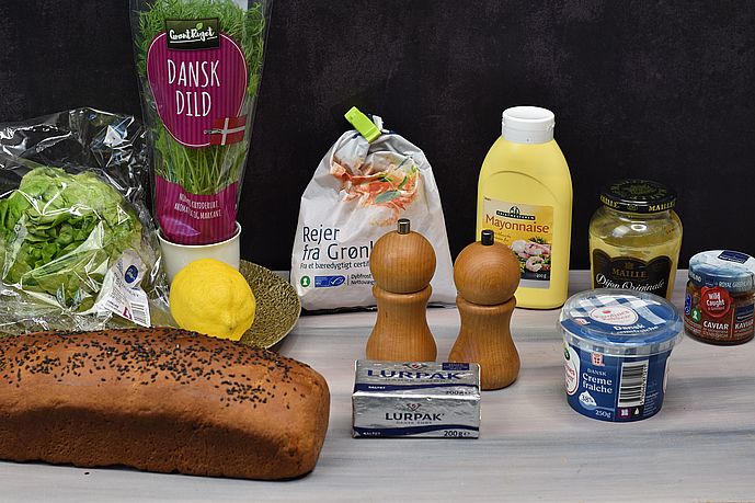 Fordel rejesalat og ørredrogn oven på salaten, og pynt med lidt dild.