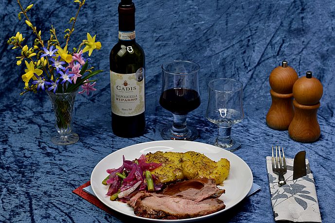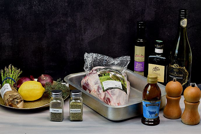 Hovedret: Grillet lammekølle med knuste kartofler, asparges og rødløg