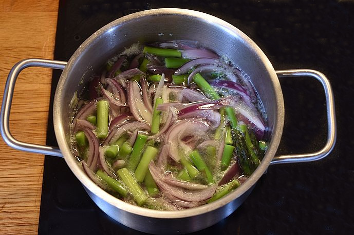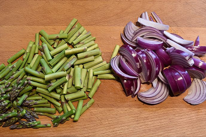 Start med at snitte asparges og rødløg ca. 1½ – 2 cm lange stykker