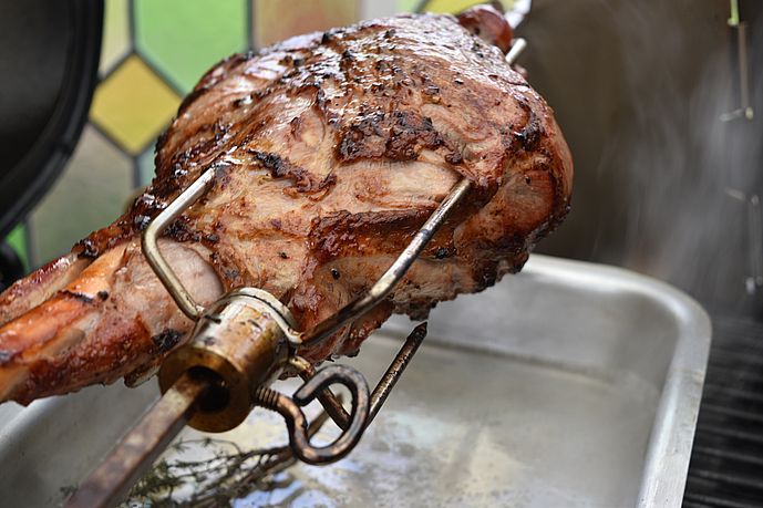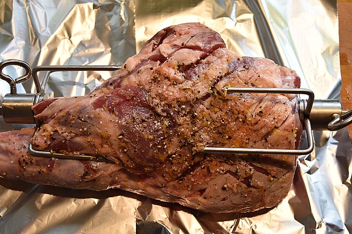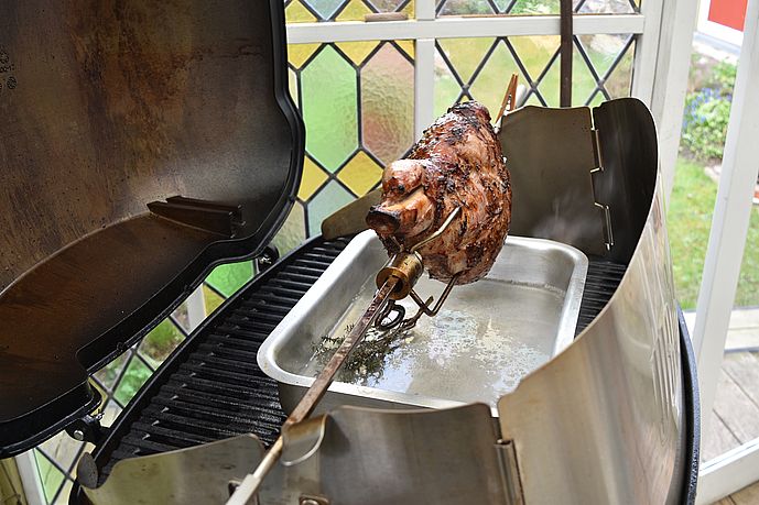 sæt lammekøllen på rotisseriet og grill med låg i ca. 1½ – 2 timer.