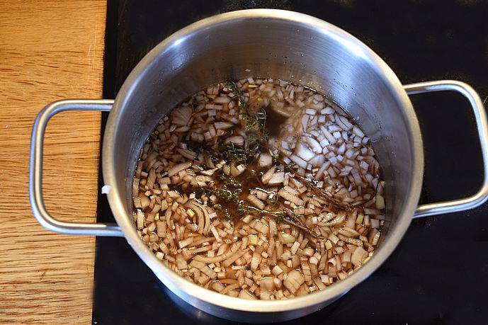 Start med at sauterer løgene i kalvefonden i 10 min.