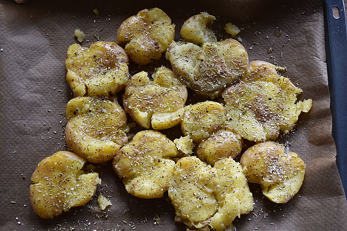 Start med at lægge de kogte kartofler på en bageplade med bagepapir