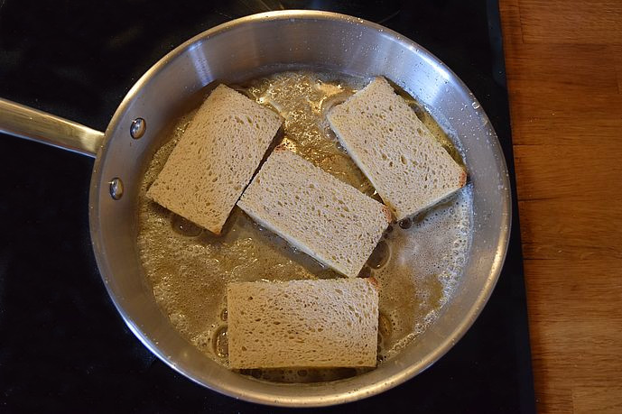 Steg brødskiverne gyldne i smør på begge sider på en pande.
