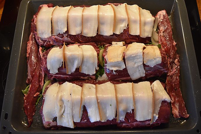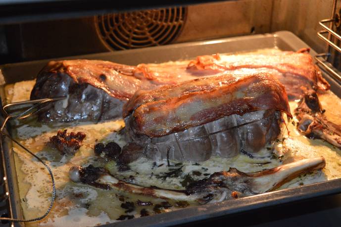 Nu sættes ovnen til 160 gr alm. ovn og steger ryggen i 50 min eller til centrum