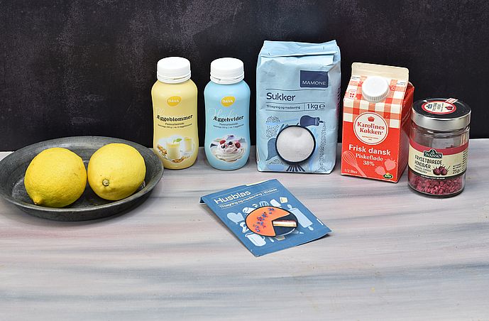 Dessert: Citronfromage med top af flødeskum og frysetørrede hindbær