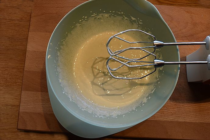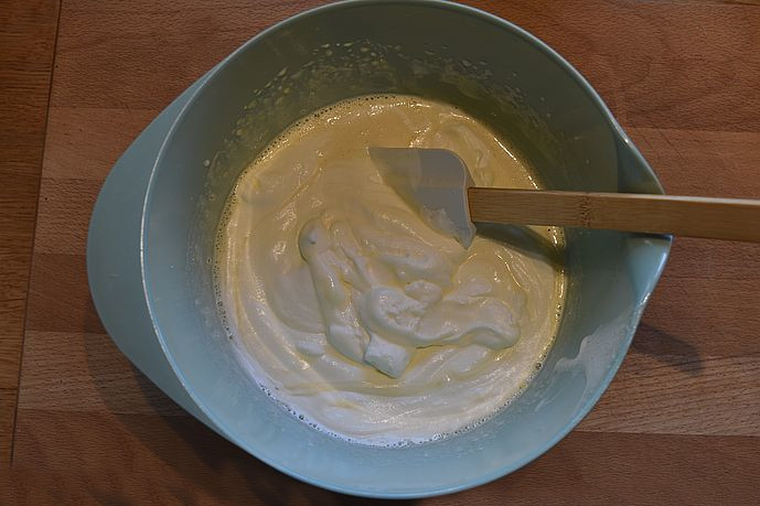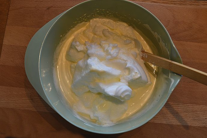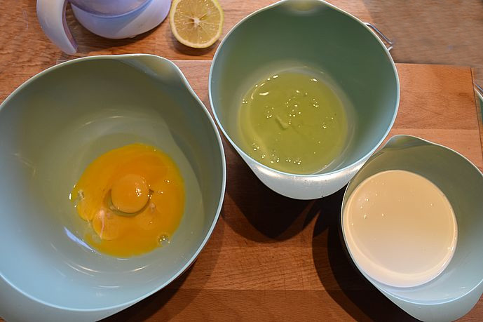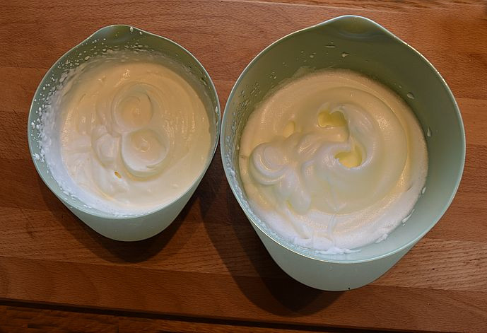 Fløden piskes let, hviderne piskes stive og saften af citronen
