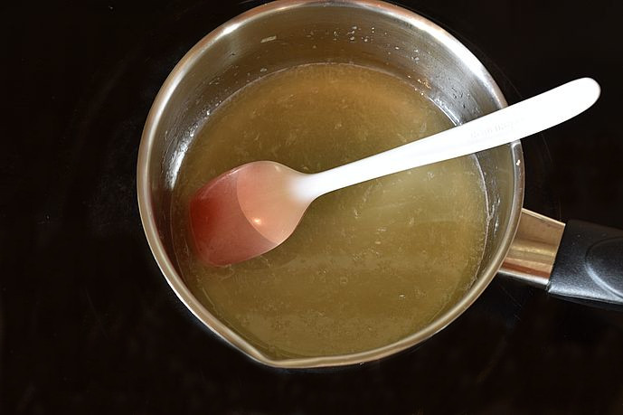 over vandbad eller meget svag varme. Køler lidt af og tilsættes