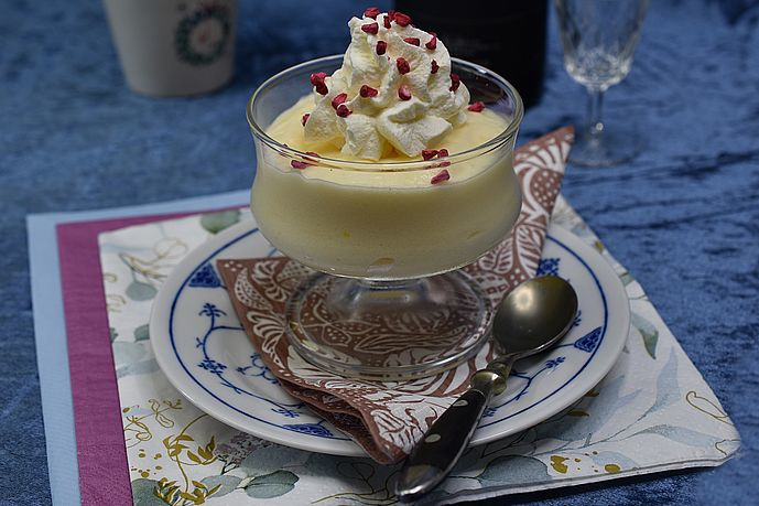 Dagens dessert, Citronfromage med top af flødeskum og frysetørrede hindbær.