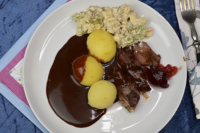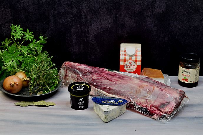 Dagens hovedret. Helstegt dyreryg, hvide kartofler, vildtsauce, waldorfsalat og,