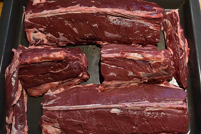 Fileterne skæres løs fra benene, og skæres i stykker på ca. 2 cm i bredden på