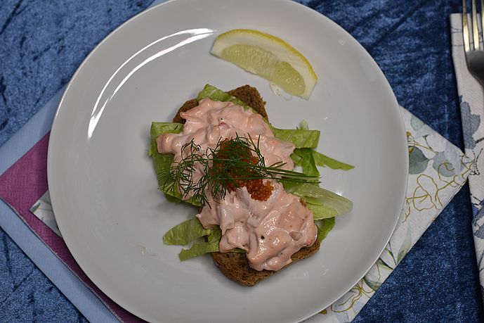 1 – 2 spsk. Krabbesalat, pyntes på toppen med ca. 1 tsk. Kaviar