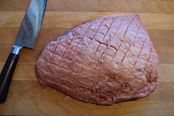 Start med at ridse fedtkanten på kødet i et harlekinmønster