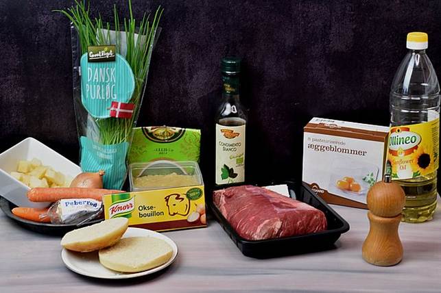 skæres fint. Retten serveres med æblemos smagt til med peberrod
