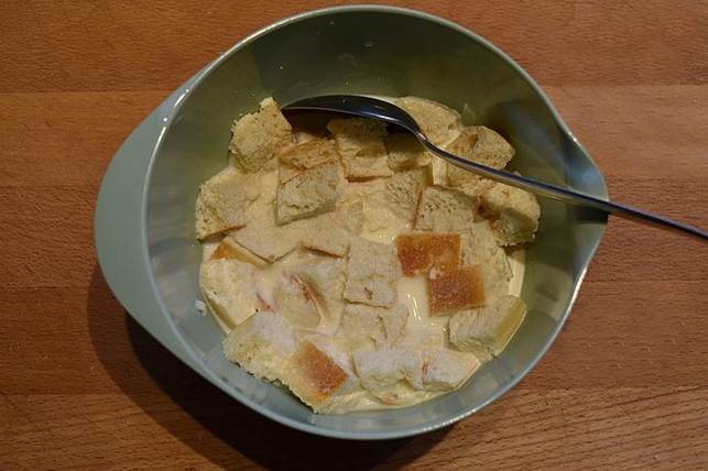 Afskorp to tykke skiver franskbrød og udblød dem