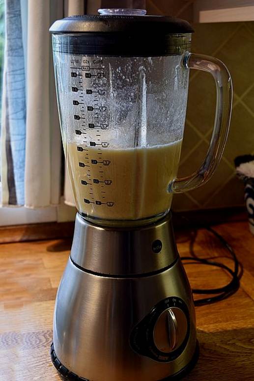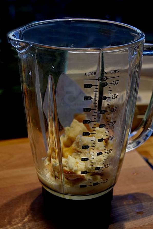 i 2 dl. Fløde. Kom det udblødte franskbrød i en blender/stavblender med