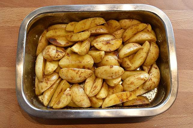 kommer olie og krydderier over alle kartoffelstykkerne