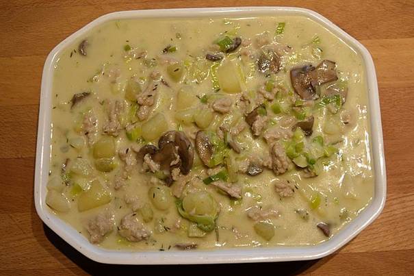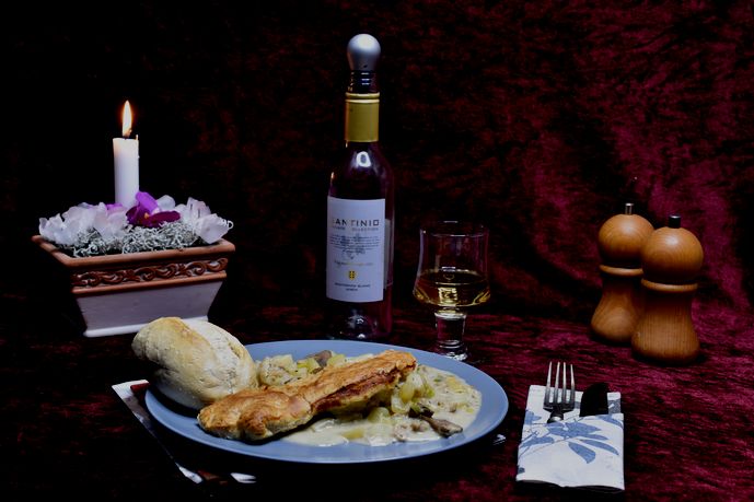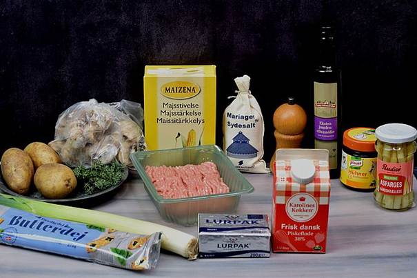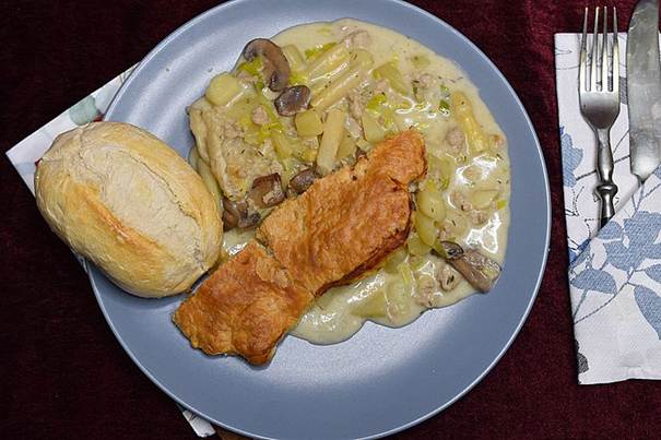 Dagens tallerken, Gammeldags Pie med kylling, hvide asparges og svampe