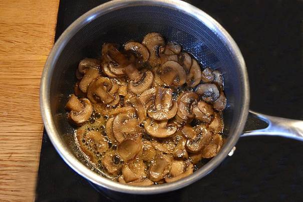 Start med at smelte smørret og tilsætte olivenolie og svampene