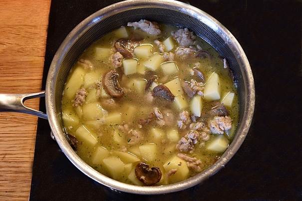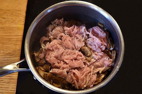 og reduceret i størrelsen. Tilsæt det hakkede kyllingefars og timian