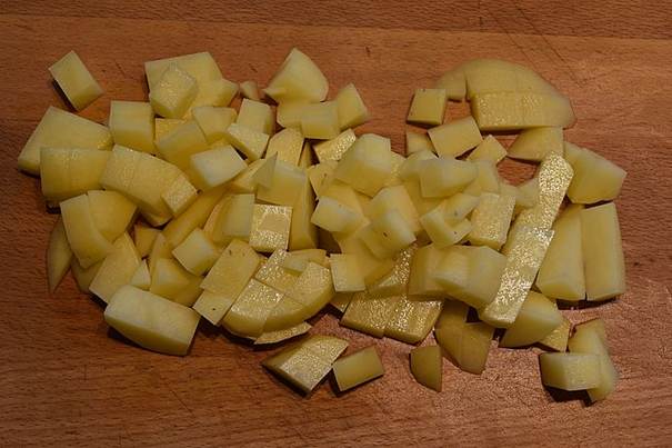skræl kartoflerne og skær dem i tern på ca. 2×2 cm. tilsæt kartoflerne