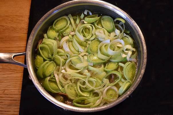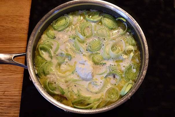 Tilsæt porrer, fløde og resten af hønsefonden. Lad igen fyldet simre