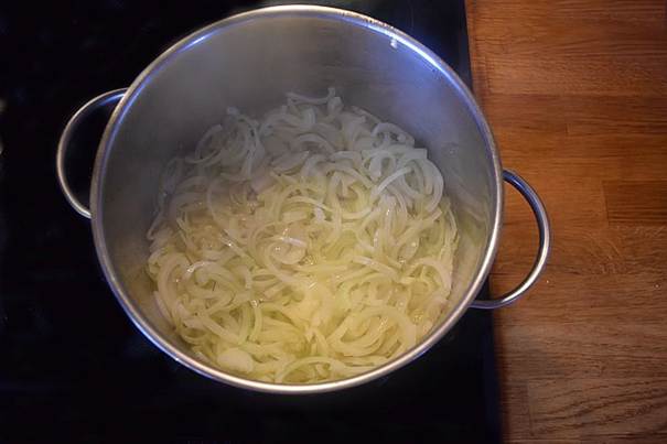 skær løgene i skiver og steg dem langsomt i smør på panden eller