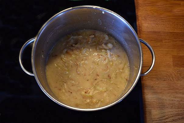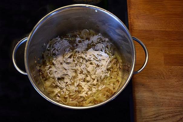 i en gryde, til der er bløde og let gyldne, drys melet over løgene og