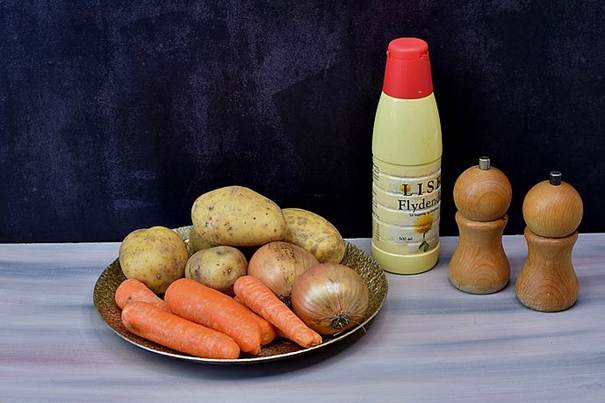 Den består typisk af: Kartofler, løg og gulerødder.