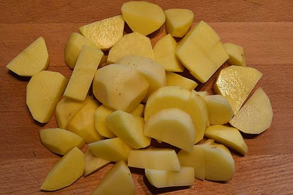 start med at skrælle og skære kartoflerne i mellemstore stykker,