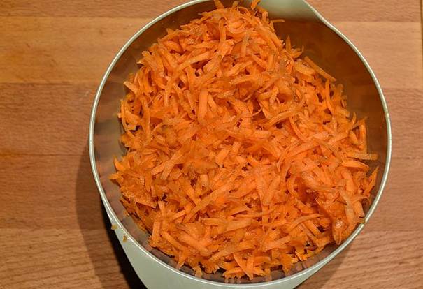 skræl gulerødderne, riv løg og gulerødder på et rivejern, og