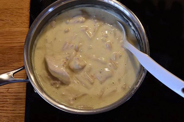 tilsæt fløde og kog igennem, smag til med salt og masser af