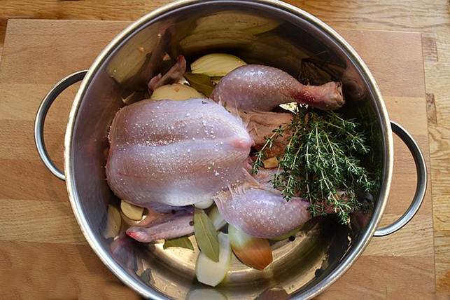frisk timian og salt. Dæk kyllingen med vand og sæt den i kog