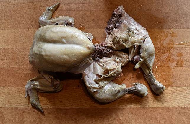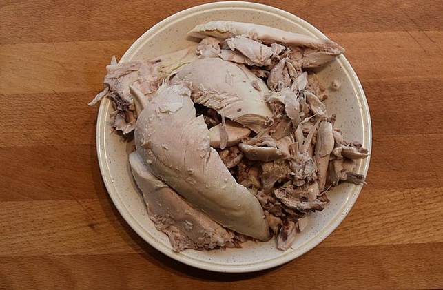 tag kyllingen op og pil kødet af ben og skrog. Læg skrog og
