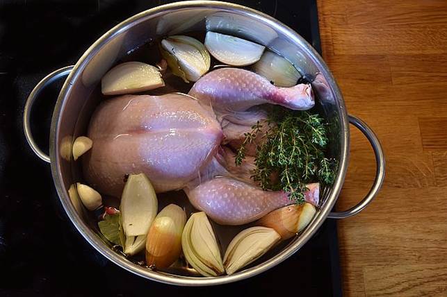 skind tilbage i gryden og kog videre i 30 min. Si hønsebouillonen