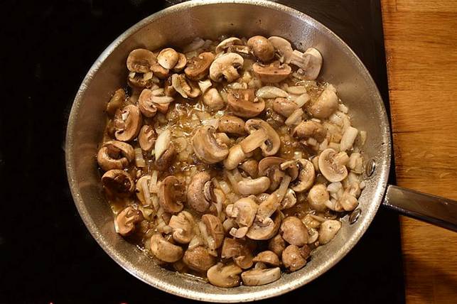 Svits skivede champignon og hakket løg på panden, tilsæt evt. en smule